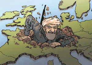 A este fenómeno de colonización étnica masiva, se añade el hecho, ya señalado, de que el islam se pone a la cabeza de la ofensiva. Desde hace 1400 años, esta religión-ideología, totalitaria y agresiva, tiene como objetivo la invasión de Europa. Sufrimos la tercera acometida mahometana que se extiende hoy desde España a Indonesia. La primera fue detenida en Poitiers, Francia por Carlos Martel en 732, después de haber conquistado la mayor parte de la penísula ibérica. La segunda fue en 1684, ante las puertas de Viena. La tercera tiene lugar hoy, desde el Cabo Finisterre hasta Copenhague, desde la isla de Lampedusa hasta hasta los fiordos noruegos. Esta tercera yihad no sólo coincide en el tiempo con la Tercer Guerra Mundial en ciernes, sino que es su condición previa.