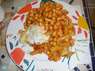 Dos botes de garbanzos, medio bote de salsa de tomate fruco, luego cuatro patatas grandes cortadas fritas y tres huevos fritos, puestos encima.