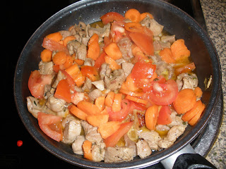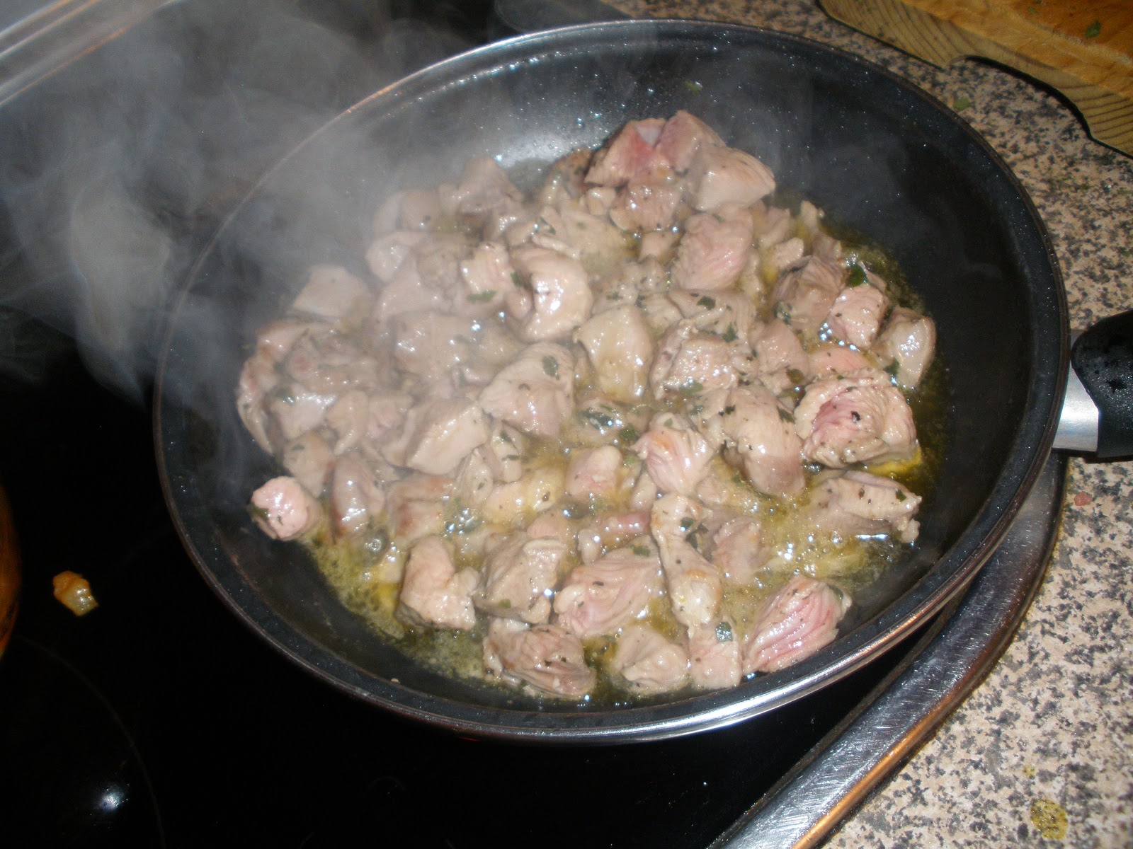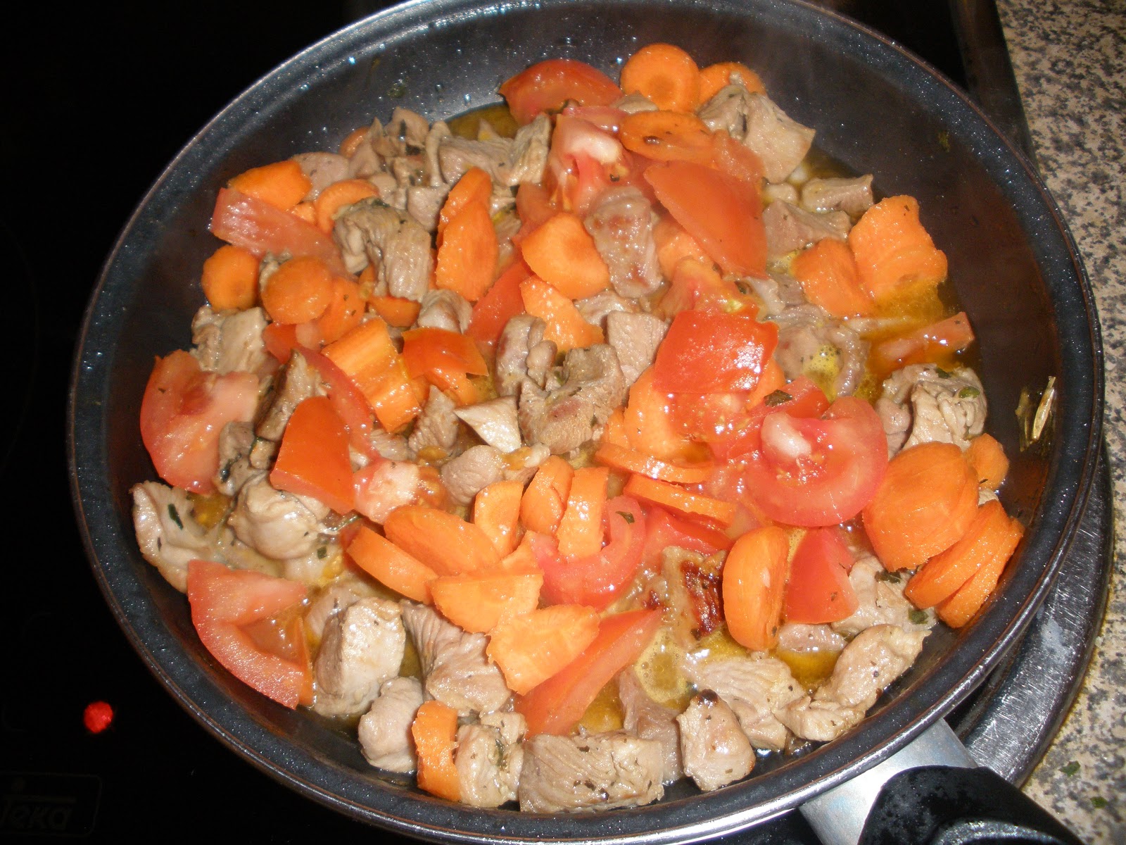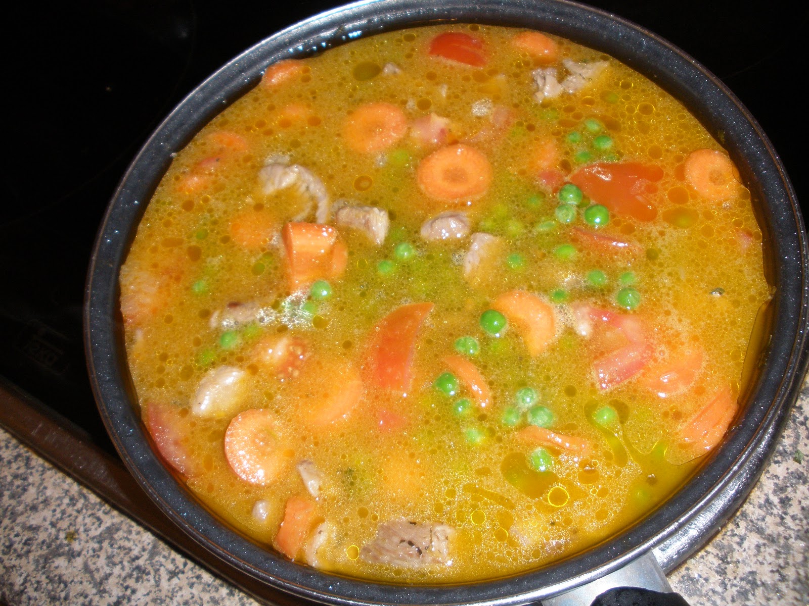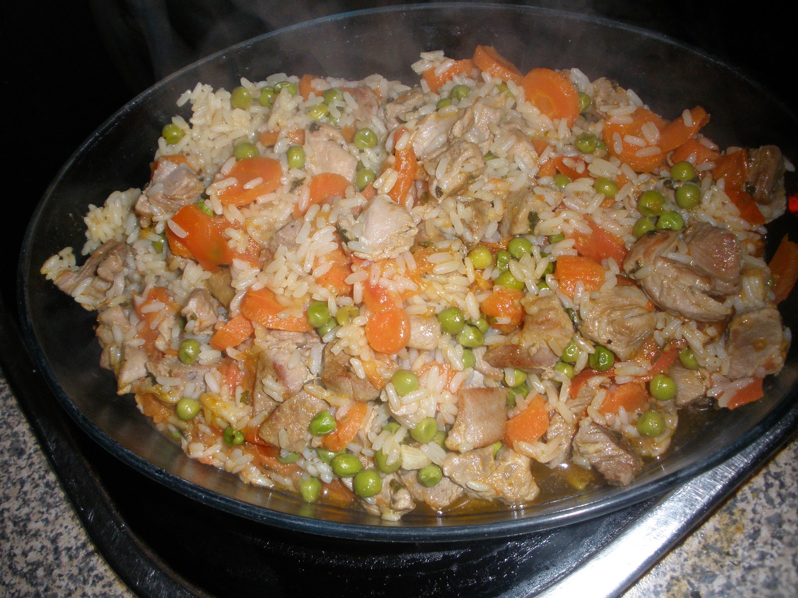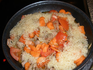 Cortadito en trozos pequeños se dora en aceite con sal y perejil, se añaden dos tomatitos cortaditos en trocitos, unos guisantes y tres zanahorias raspadas y cortadas en círculitos, y el zumo de una naranja, y un poco de vino blanco, finalmente una taza de arroz y dos y media de agua y se deja hacer bajando el fuego.