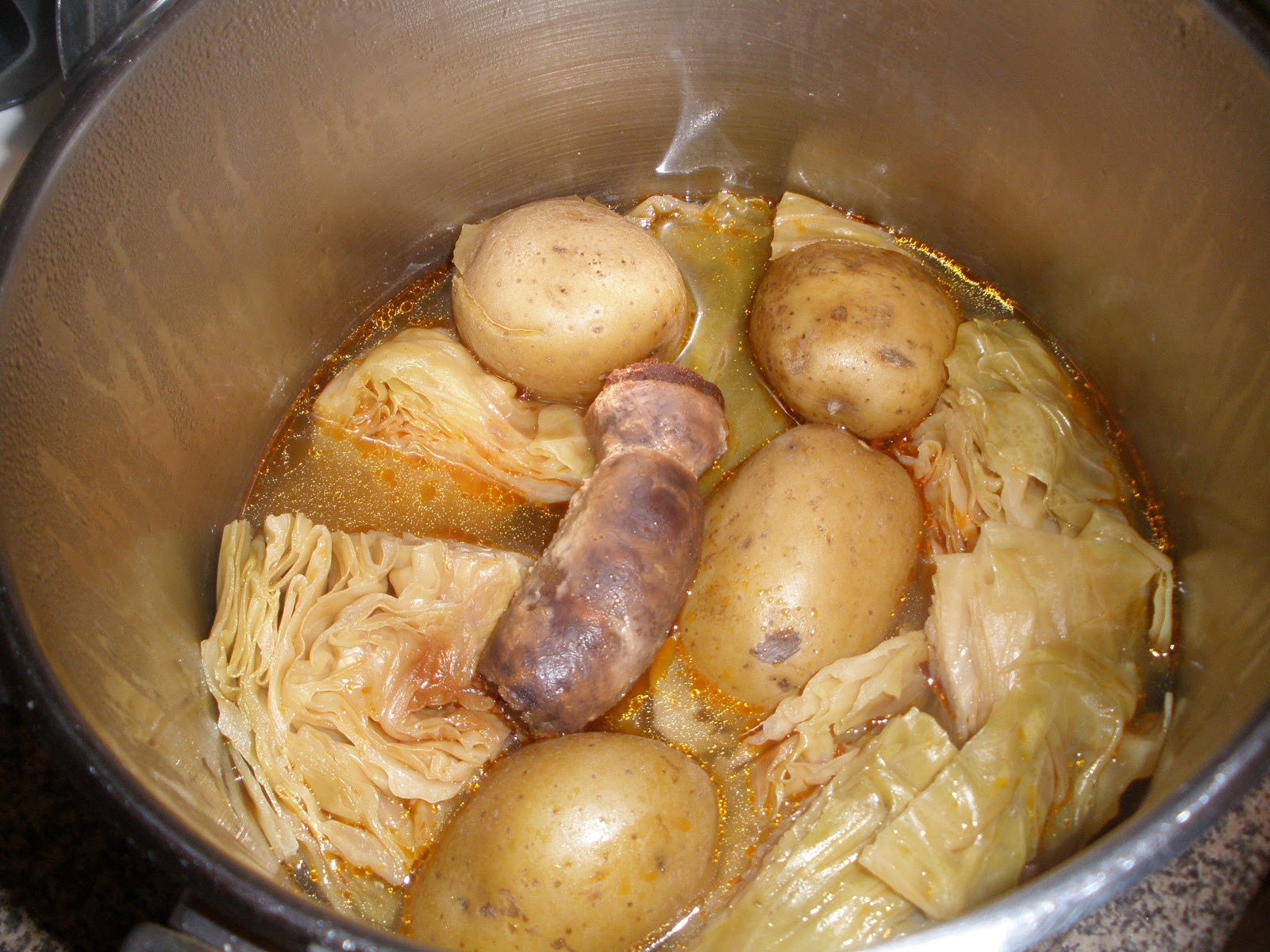 Una col con 4 patatas enteras y un gran chorizo cocida en olla exprés con agua, sal y aceite, para acompañar lo anterior si gusta.