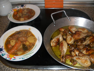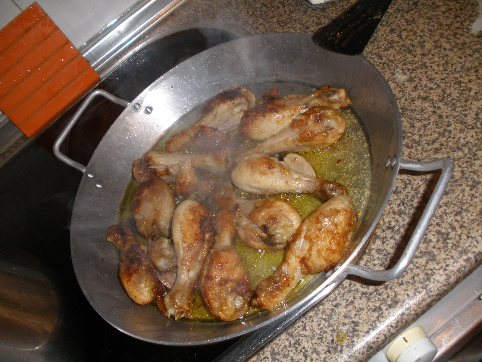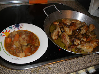 Muslitos de pollo sin piel, en harina y pan rayado, dorar mucho dándoles vueltas en aceite con tres dientes de ajo, con su piel, cortados al medio y sal, y media bolsa de aceitunas, luego un chorrito de whisky JB y un chorretón de vino blanco de cocina, hasta que se evapore y reduzca.