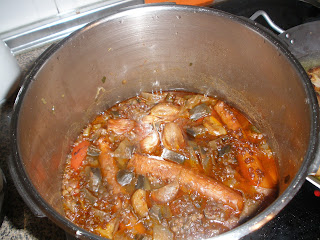 Lentejas para 6, aceite oliva virgen extra, una cabeza de ajos desdentada, una cebolla en trozos, laurel, perejil, 6 zanahorias raspadas y enteras, 8 patatitas pequeñas peladas y cortadas en rodajitas, taquitos de jamón en abundancia, 2 tomates cortados en 8 trozos dando tres tajos atravesados juntándolos, vinagre, pimentón dulce, 2 berenjenas cortaditas en daditos, tres chorizos medianos, sal y agua bien cubiertas.