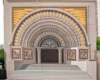 Parece que el muro está roto y que tras el hay una columnata porticada con estatuas.
