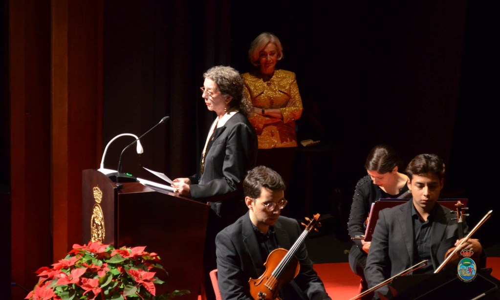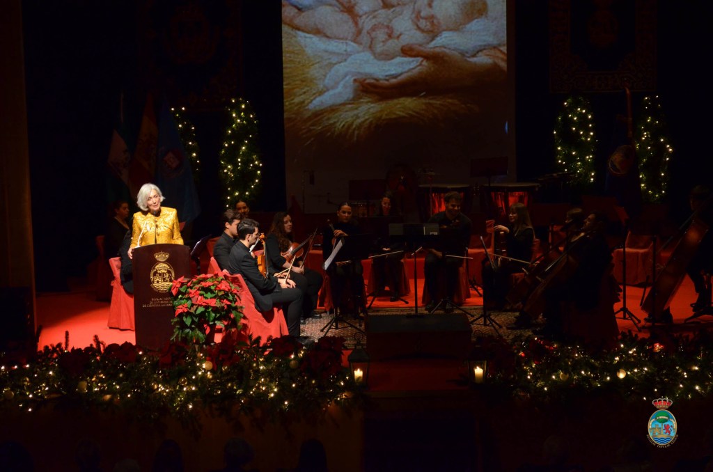 La escritora y profesora Dña. Carmen Guaita Fernández tuvo a su cargo, el pasado sábado 13 de diciembre, el Pregón de Navidad que anualmente organiza la Real Academia de San Romualdo de Ciencias, Letras y Artes, por encomienda del Ayuntamiento de San Fernando desde que así se estableciera en el año 1964, tal y como recordó la señora secretaria de la institución académica, Dña. Adelaida Bordés Benítez, en las palabras de introducción de un acto celebrado en el Real Teatro de las Cortes de San Fernando, cuyo escenario fue decorado con motivos navideños para un acontecimiento que consta de dos partes diferenciadas: el pregón en sí y el Concierto de Navidad, que en esta ocasión estuvo a cargo de una orquesta que dirigió el maestro D. Enrique Busto Rodríguez y en el que se interpretaron distintas obras, desde villancicos clásicos a piezas relacionadas con las artes escénicas como el cine y sus películas con temática navideña.