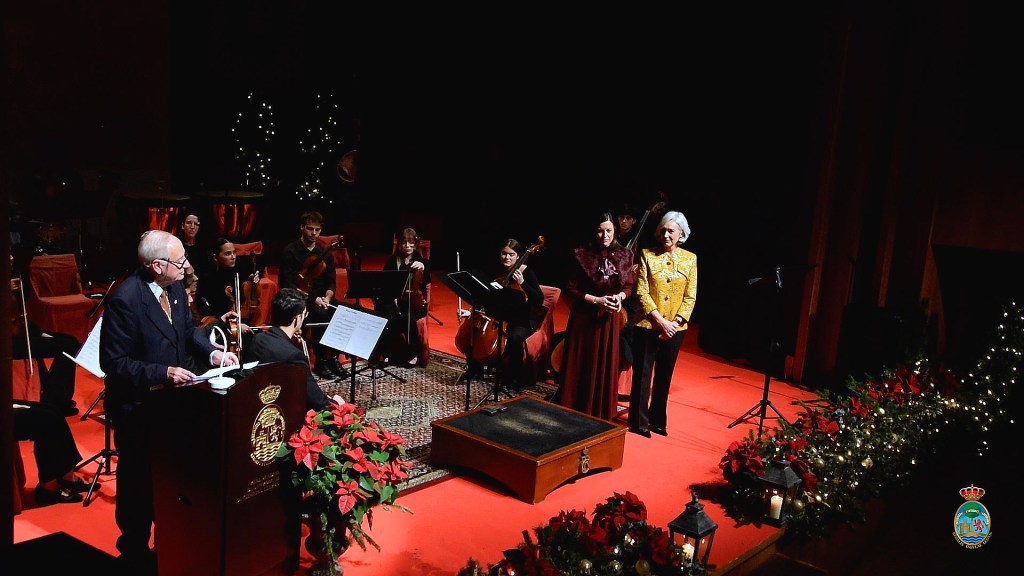 Comenzó posteriormente el concierto de Navidad con la orquesta y la soprano Dña. Carolina de Alba, que interpretaron las siguientes obras: Blanca Navidad, de Irving Berling; Somewhere in my memory, tema de la película Solo en casa cuya banda sonora está compuesta por John Williams; Carol of the Bells, del compositor ucraniano Mykola Leontovych; Cantique de Noël, del autor francés Adolphe Adam; Sleigh Ride, del músico norteamericano Leroy Anderson; A Christmas Festival, una recopilación en la que volvieron a intervenir juntas Dña. Carolina y Dña. Rosa María de Alba. Madre e hija, en plenitud vocal, cogidas de la mano y emocionadas, en perfecta conjunción, que invitaron al público a cantar con ellas el popular y universal Adeste fideles con los músicos dirigidos por el maestro D. Enrique Busto que, para finalizar, tuvo la gentil iniciativa de cederle la batuta al compositor y académico correspondiente de San RomualdoD. Manuel Pérez Rodríguez, para que dirigiera el Himno de la Academia de San Romualdo, del que es autor, con el que se dio por finalizado un brillante y emotivo acto y que esta Academia ofrece completo en su canal oficial de YouTube enlazado a continuación. También se acompaña el enlace en audio al XXX Pregón de la Navidad para disfrutar exclusivamente de él en formato audio pudiendo ser descargado en archivo, y una galería fotográfica.