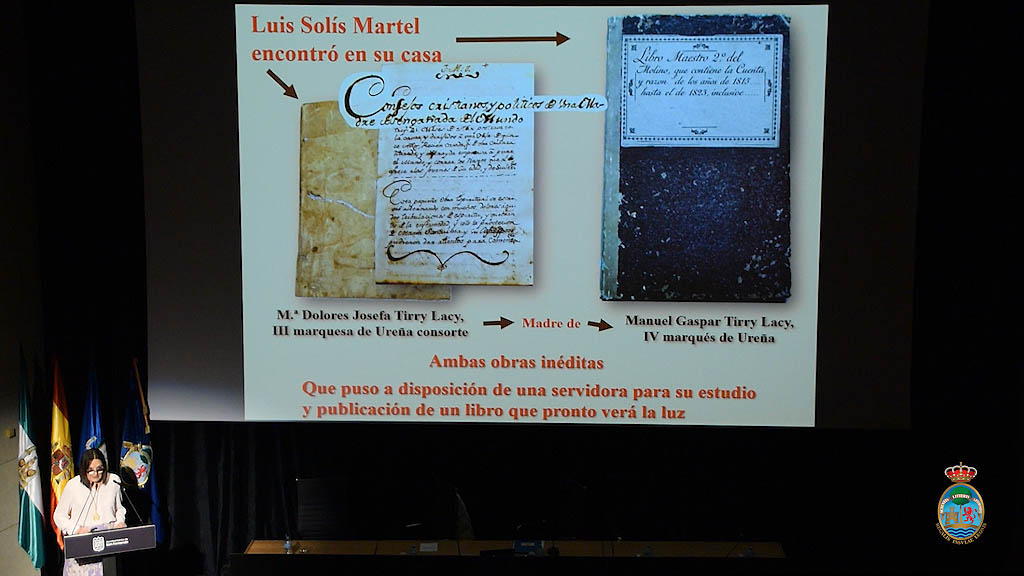Pero los hallazgos no terminan aquí. Dña. María Elena Martínez Rodríguez de Lema reveló que su ‘nuevo amigo’ heredero de los Ureña encontró también, en casa de su madre, una vetusta publicación bajo el título Libro maestro 2º del molino, que contiene la cuenta y razón de los años de 1815 a 1823, escrito de puño y letra de D. Manuel Gaspar Tirry Lacy, IV marqués de Ureña y a la sazón hijo de María Dolores Tirry, autora del libro de sufrido título anteriormente descrito y dado a conocer también en la conferencia por Martínez Rodríguez de Lema.